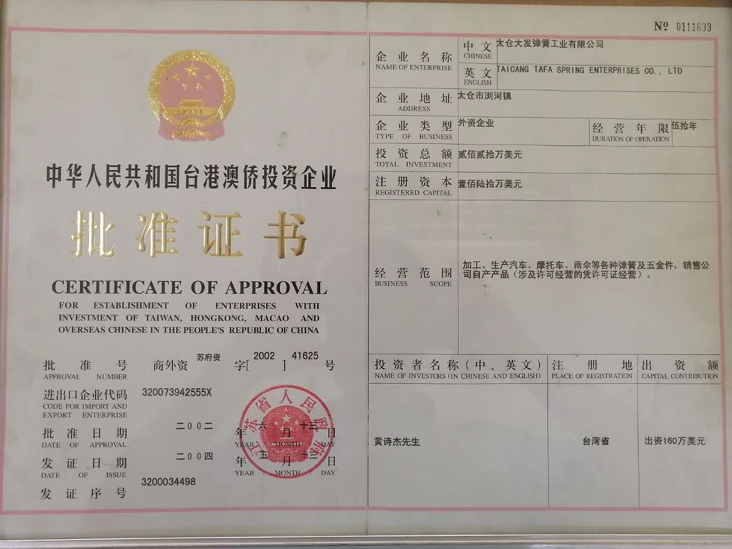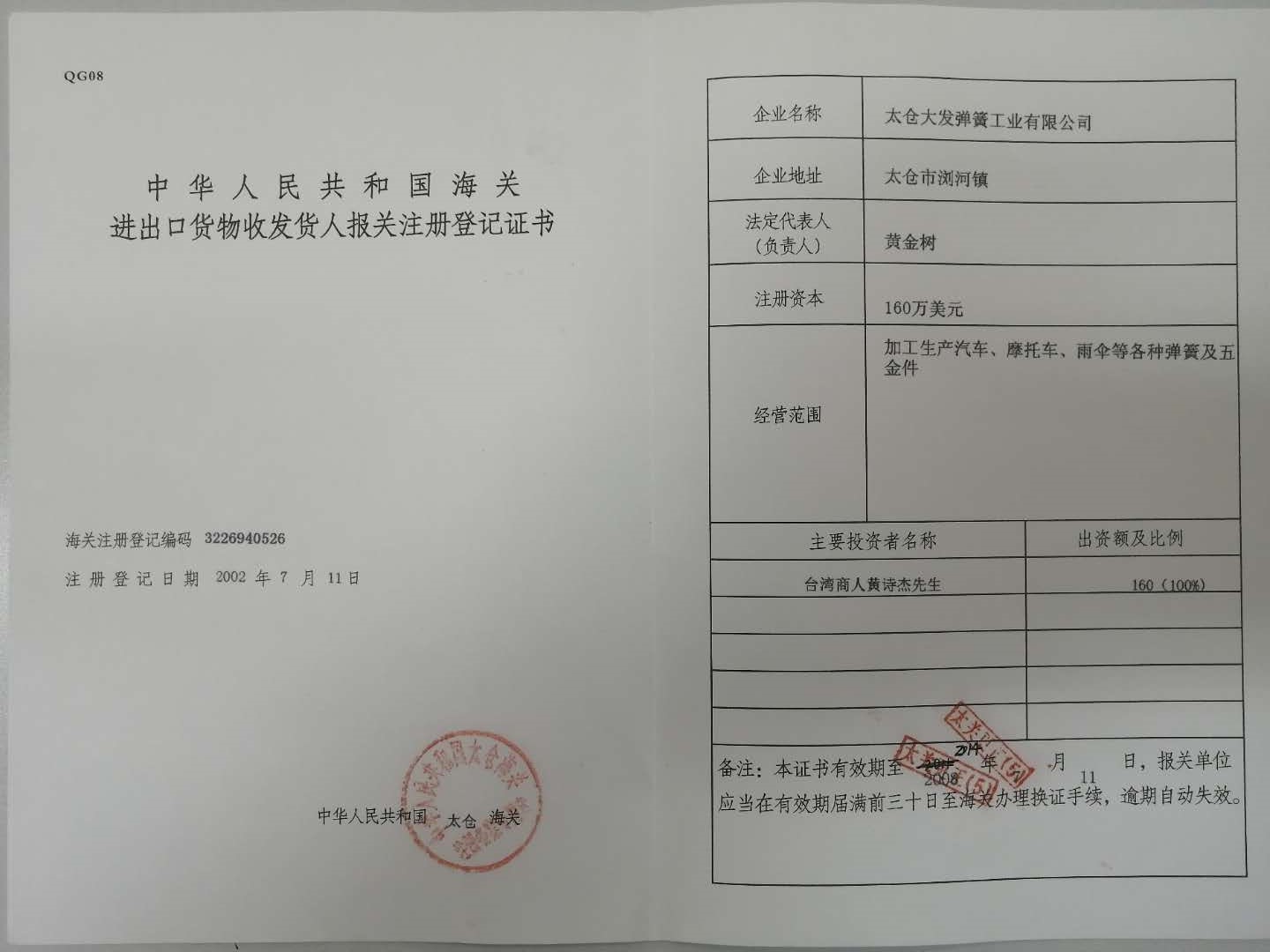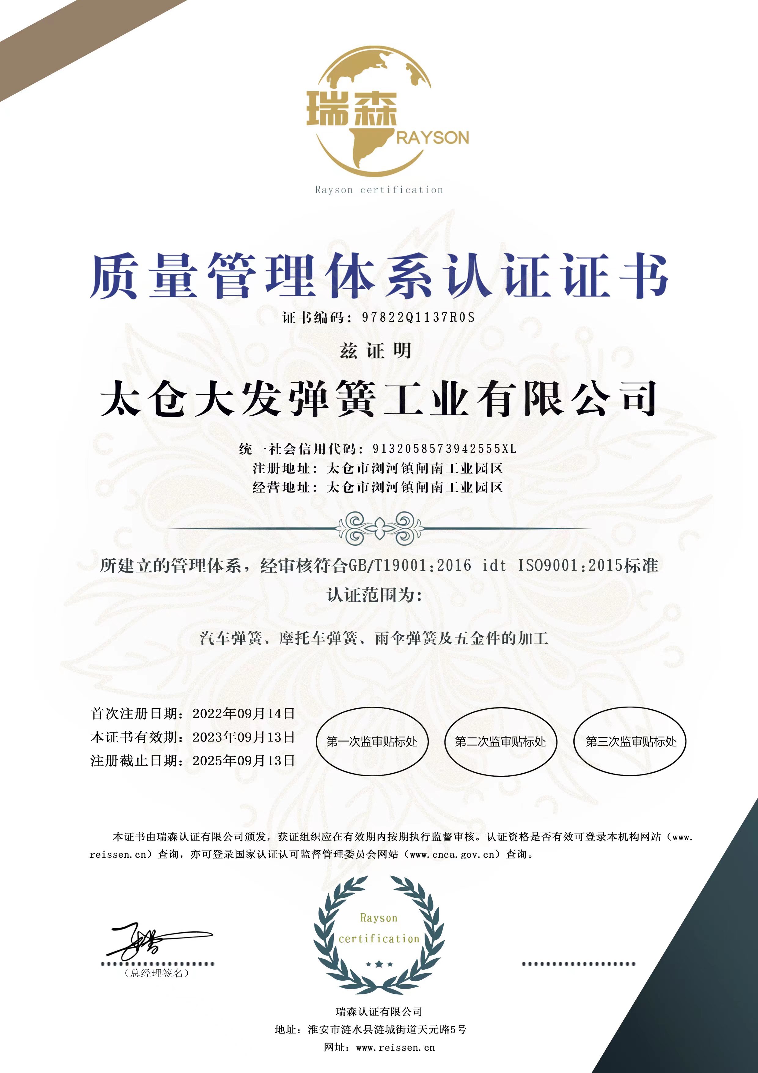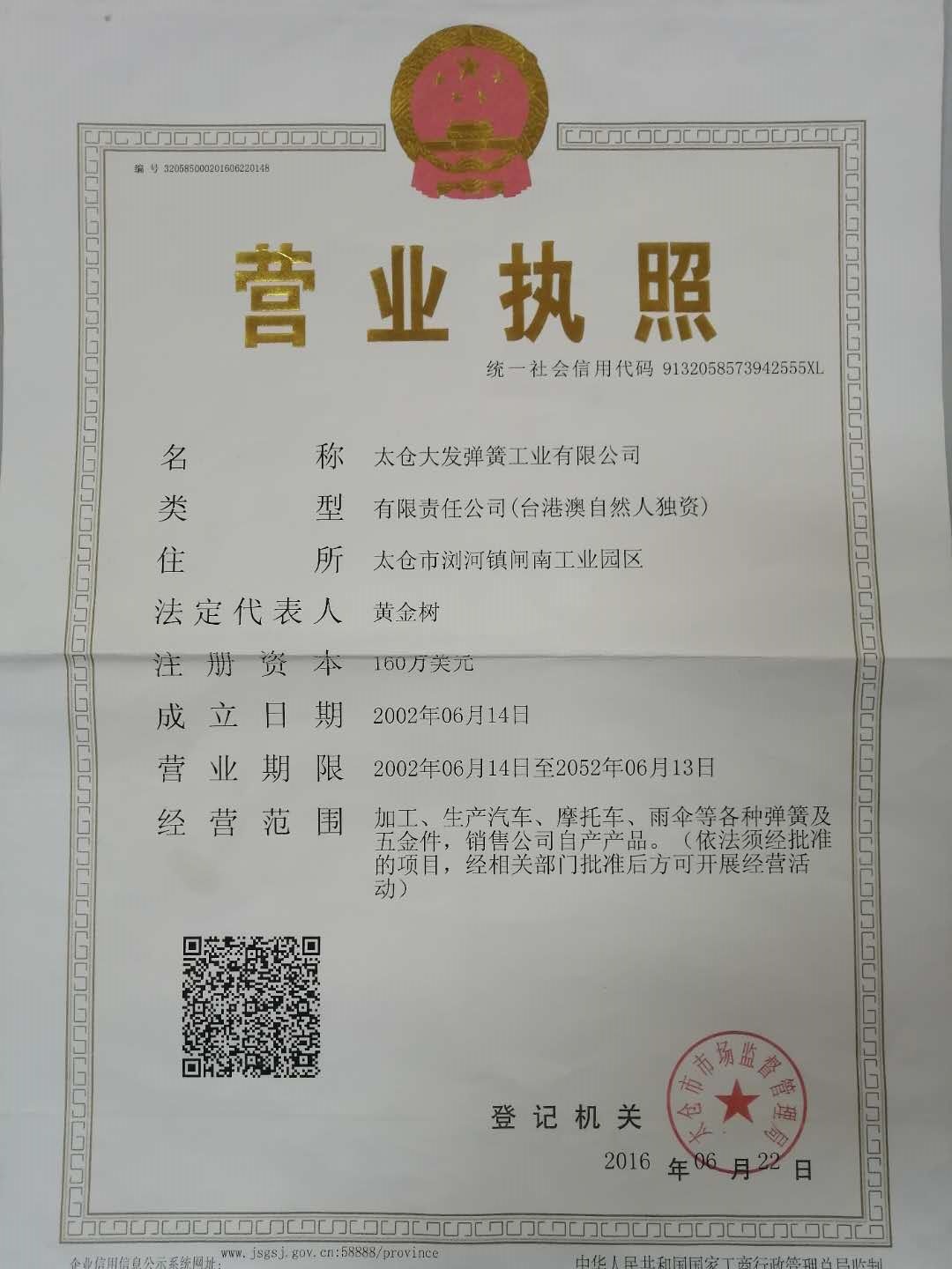太倉大發(fā)彈簧工業(yè)有限公司由黃金樹先生于1967年始創(chuàng)于臺(tái)灣,是一個(gè)集雨傘、電子、五金機(jī)械、自行車、摩托車、汽車等的彈簧配件生產(chǎn)、加工、輔助設(shè)計(jì)服務(wù)的綜合性企業(yè),其中1990年創(chuàng)辦的廈門大發(fā)彈簧公司、2000年創(chuàng)辦的深圳大發(fā)彈簧公司、2002年創(chuàng)辦的太倉大發(fā)彈簧公司均位于經(jīng)濟(jì)發(fā)展地區(qū),地理位置佳。我們憑借在彈簧制造業(yè)的多年豐富知識(shí)與技術(shù),并著眼于以客戶為導(dǎo)向,秉持“以人為本,以質(zhì)為先,以客為主,持續(xù)創(chuàng)新”的經(jīng)營理念,強(qiáng)化競(jìng)爭(zhēng)優(yōu)勢(shì)。公司導(dǎo)入ISO9001: 2000質(zhì)量管理體系,執(zhí)行ISO14000:2000管理方式,倡導(dǎo)安全、高質(zhì)量、高素質(zhì)的生產(chǎn)。